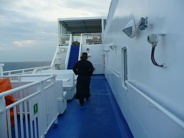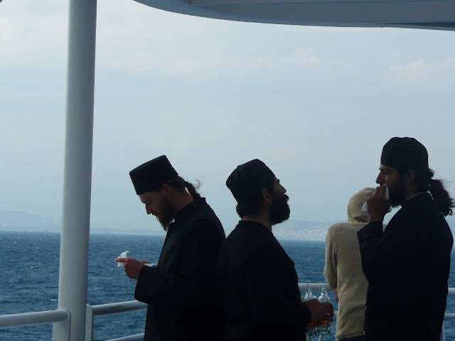 Hay una hermosa terraza desde donde se divisan bellísimas vistas del siempre tranquilo mar Egeo, por donde, ni siquiera, se ven embarcaciones. Todo es silencio, solo el rumor del mar y las gaviotas son protagonistas. Desde las ventanas también se divisa el mismo espectáculo. Los monjes comparten con las visitas sus licores y los típicos dulces elaborados por ellos. Una pequeña huerta les provee de hortalizas. Las gallinas picotean y los gatos toman el sol indiferentes.