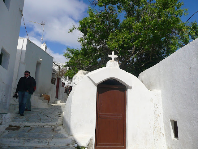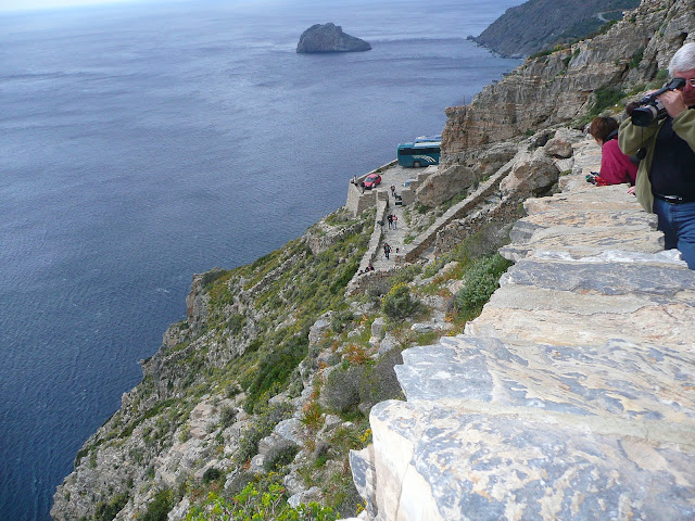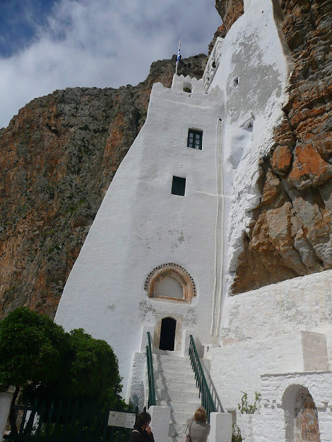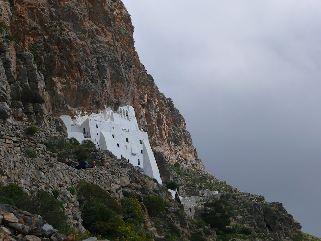 Uno de los lugares imprescindibles, visita obligada,  que nadie puede perderse, es el Monasterio de Chozoviotissa, un monumento incrustado en un enorme farallón a 300 metros sobre el nivel del mar. Este monasterio, del siglo XI, pasará en breve a ser Patrimonio de la Humanidad. Un equipo responsable de la Unesco trabaja para que así sea. El monasterio se encuentra a pocos kilómetros de Amorgós  y llama poderosamente la atención su espectacularidad, tanto por su estructura como por su ubicación. Cuando se contempla, se pueden  imaginar los argumentos que esgrime la UNESCO para que sea patrimonio de todos; y uno de ellos, tal vez el más importante, la fe, una fe que ahora retrocede pero que gracias a ella podemos asombrarnos con su contemplación.